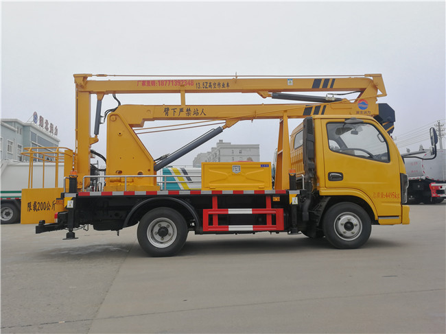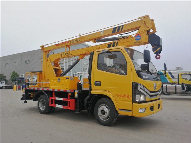 新款東風單排18米高空作業車采用折疊式曲臂結構,作業臂為三節折疊式,工作斗和轉臺雙工作位,上下操作,液壓手動控制,可360度回轉,四液壓支腿,帶1噸吊鉤,工作斗最大承重200公斤,鋼制工具箱及圍板、花紋防滑走臺板。