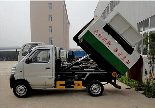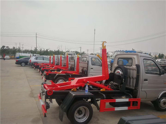 3.車廂可卸載式垃圾車,又稱勾臂式垃圾車、拉臂式垃圾車。該車廣泛適用與城市街道學校垃圾處理,可一車配備多個斗,各個垃圾點放置多個垃圾斗,帶自卸功能,液壓操作,方便傾倒。該車的箱體部分完全由液壓系統來控制,在平日里可將車載垃圾箱放置到各個垃圾收集站,待垃圾收集滿后,該車可直接開赴至垃圾站,通過液壓系統的操控,可將垃圾車后座上加裝的勾臂放下,掛住站內垃圾箱前端的連接點,將垃圾箱拉至車體的后座上,此時即可啟動車輛,將垃圾運送至垃圾處理站內,進行自卸式傾倒。