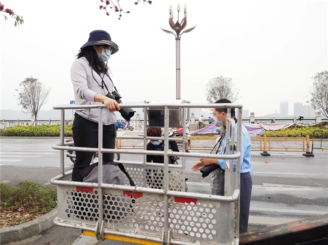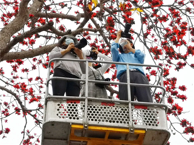 原來(lái),是攝影愛(ài)好者為了拍下美美的木棉花,租下了高空作業(yè)車,與閱江樓門前怒放的紅棉來(lái)個(gè)“近距離接觸”。